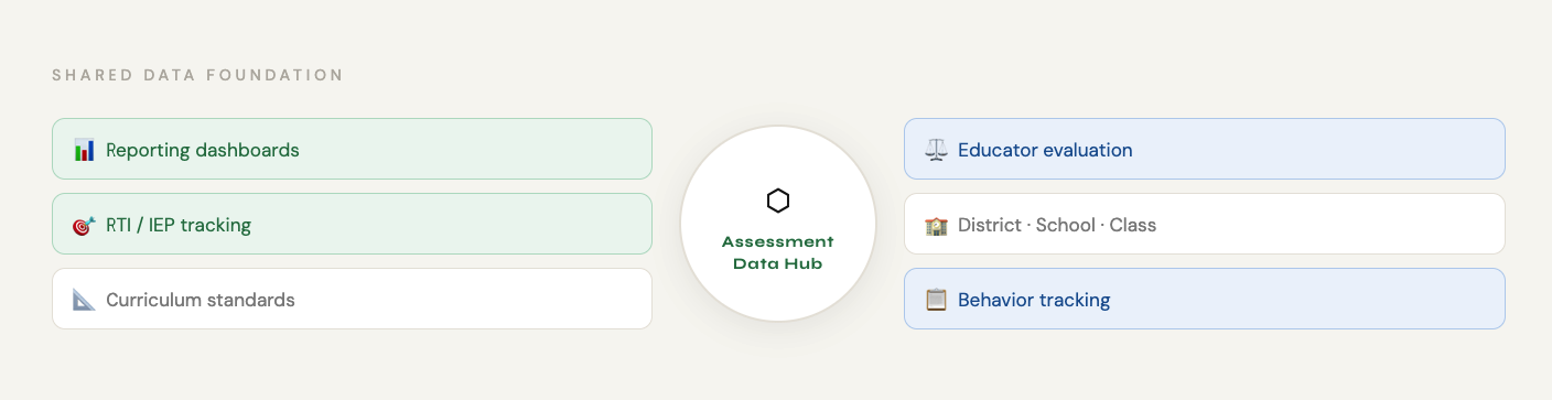 • Shared data foundation across workflows The same assessment data supports reporting, curriculum planning, and educator evaluation, which reduces parallel data maintenance and keeps operational overhead predictable as scale increases.