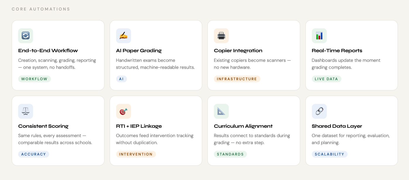 Paper-based exams added complexity to an already demanding process. Many schools relied on paper for practical, instructional, or policy reasons, which introduced scanning and transcription work into the assessment cycle. Generic automation tools failed to fit classroom conditions or integrate with reporting workflows, leaving schools with fragmented processes that consumed time without reducing workload.